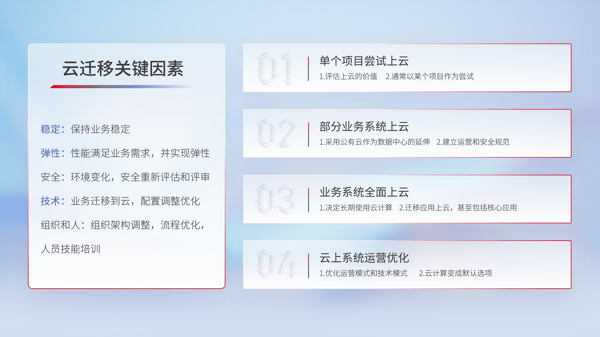结合实际业务,,,,从规划设计、、、、云平台选型、、、、云原生改造、、数据迁移、、、集成交付,,,,迁移全过程为客户识别最佳上云路径,,,做好风险识别管理,,设计网络架构、、身份权限、、、、安全审计合规、、、操作审计、、日志审计、、、监控告警策略、、、多站点容灾设计等,,,对云上基础设施进行整体规划,,,提升IT治理水平,,以满足弹性、、、、高可用、、、、高性能的需求。。。