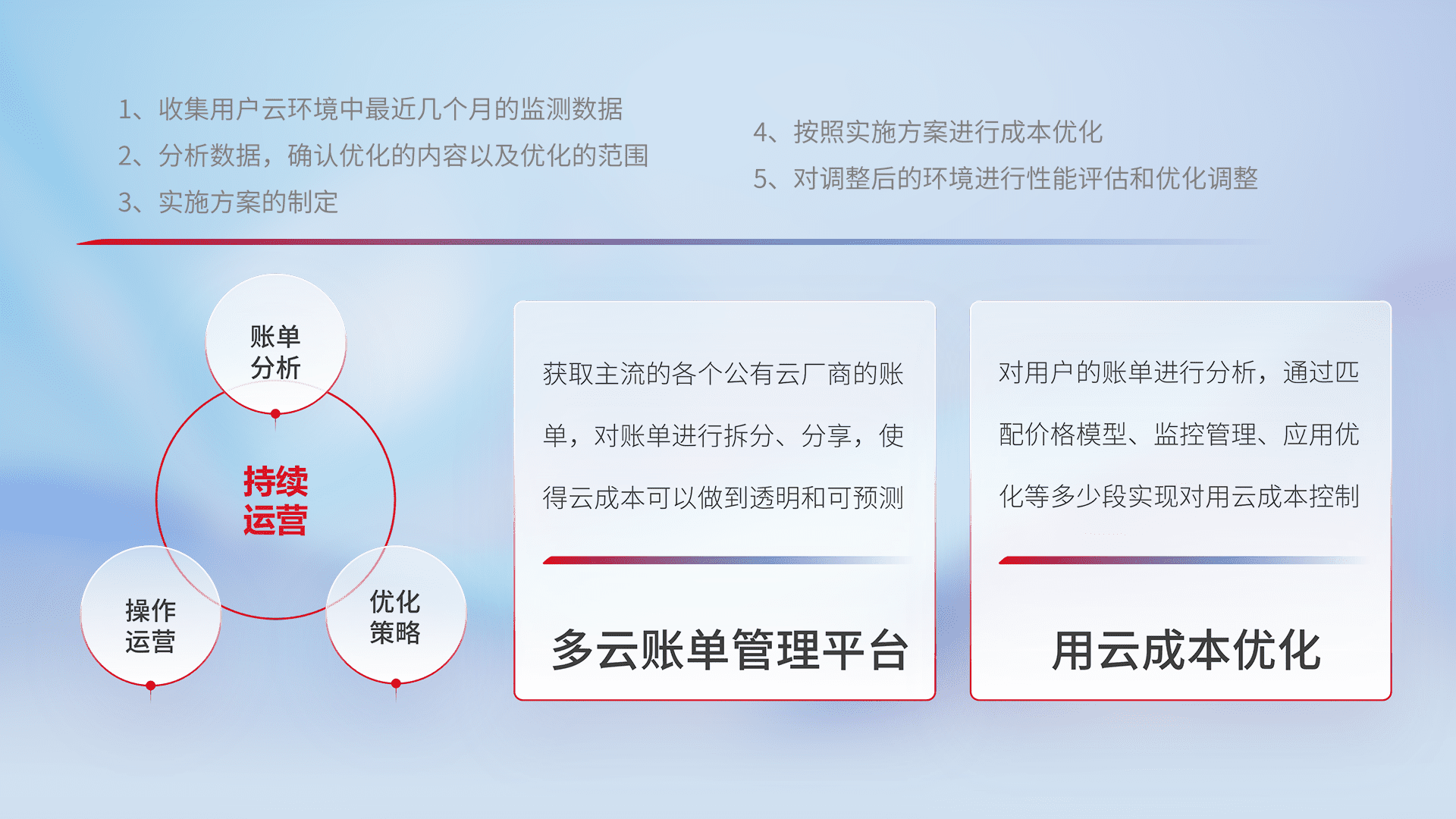 通过多云纳管,,以统一的资源数据模型把客户的云资源进行抽象和封装,,,,进而实现对多云资源的统一操作,,保障云资源管理的可靠性、、、稳定性与可用性。。量身定制化运维内容,,,配置、、、开发运维、、补丁管理、、、备份、、监控、、、认证和访问管理、、审计和日常巡检等,,,保障在用云过程中的可靠度,,稳定度以及高可用率。。。